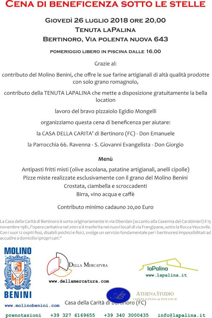 Nella cornice della bellissima Tenuta La Palina di Bertinoro, siamo lieti di invitarvi alla cena di beneficenza organizzata per aiutare e sostenere la Casa della Carità di Bertinoro Giovedì 26 Luglio ore 20.