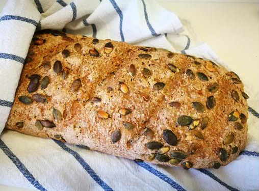 Per realizzare questo delizioso pane occorre tostare i semi di zucca sgusciati. In una planetaria impastare la farina con un pizzico di germe di grano con l’acqua il lievito, il sale e i semi di zucca.